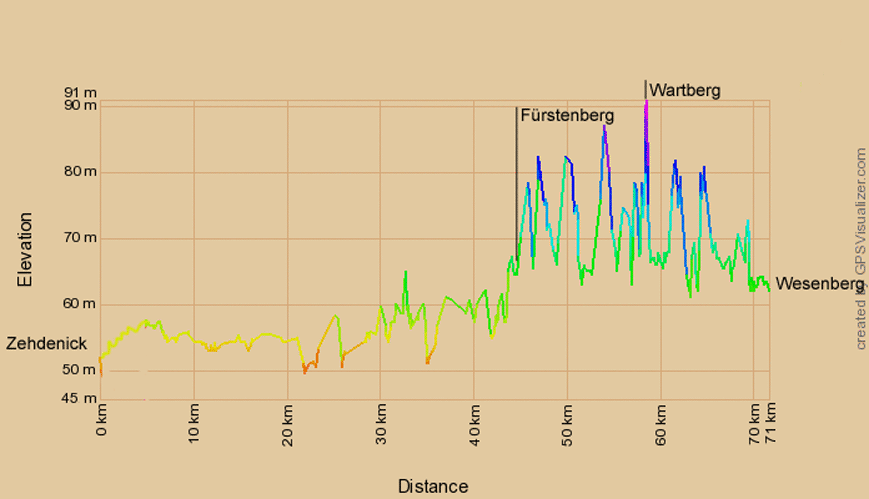 In der Abbildung am unteren Ende der Seite ist das Höhenprofil für die Radtour von Zehdenick nach Wesenberg dargestellt. Die Höhenunterschiede sind zwischen Zehdenick und Fürstenberg sehr moderat, dieser Abschnitt ist fast eben. Am Stadtrand von Fürtenberg steigt der Radweg gleich spürbar an und es bleibt bis Wesenberg bei einem Auf und Ab - die Höhendifferenzen liegen jedoch in diesem Abschnitt nur zwischen 20 und maximal 25 Metern.
