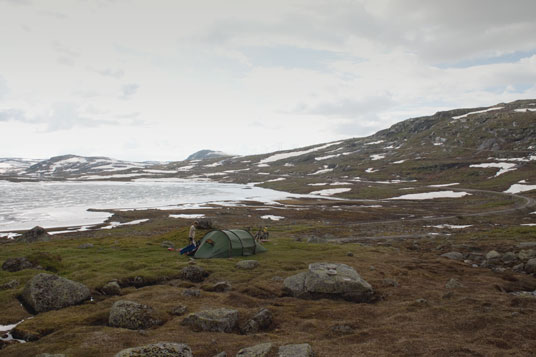 Wenige Kilometer hinter Finse gibt es gute Zeltmöglichkeiten bei N 60,61047° O 7,45018° mit herrlichem Blick auf den Sandåvatnet. In etwa einem Kilometer Entfernung liegt ein ehemaliges Streckenwärterhaus aus Holz mit dem für Skandinavien üblichen roten Anstrich. Da die Häuser in Privatbesitz sind, sollte dort nicht gezeltet werden.