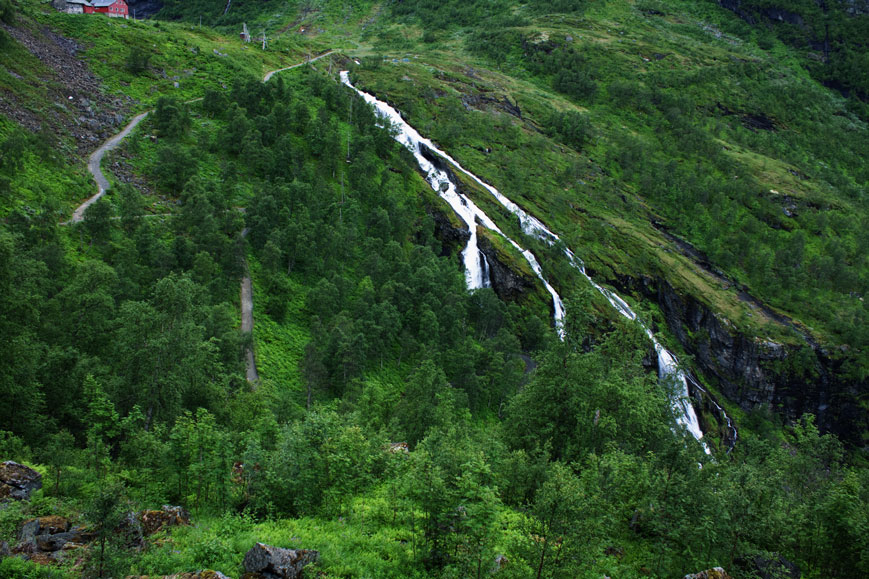 Auf einer Distanz von knapp zwei Kilometern fällt der Weg fast 300 Höhenmeter nach unten. In 21 Serpentinen schlängelt sich der Rallarvegen mit 18% Gefälle abwärts. Links von der Piste stürzt ein Bach den steilen Hang hinunter ins Flåmsdalen.