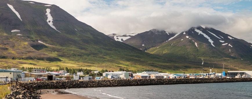 Akureyri ist mit seinen 19000 Einwohnern die viertgrößte Stadt Islands. Außerhalb des Hauptstadtbezirks um Reykjavik ist die Hafenstadt Akureyri sogar das größte Bevölkerungszentrum des Landes. Sie erstreckt sich am inneren Ende des Eyjafjörður. Oft liegen Kreuzfahrtschiffe im großen Hafen. Es gibt mehrere Supermärkte und in dem etwas abseits der Ringstraße gelegenen kleinen Zentrum wird sogar eine kurze Fußgängerzone mit Cafés und Restaurants geboten. Nett ist auch der Botanische Garten, eine blühende Oase in der kargen Landschaft Islands.